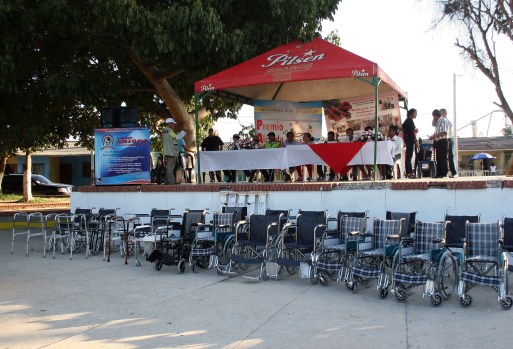 Entrega formal de 16 sillas de ruedas para adultos, 5 sillas de ruedas pediátricas 5 bastones tipos paraguas, 2 bastones para invidentes, 5 pares de muletas, 2 ayudas sanitarias portátiles y 5 caminadores plegables. Todos eran elementos importados de los Estados Unidos, país que fabrica excelentes productos ortopédicos.