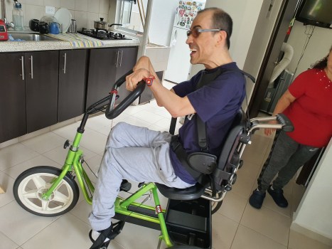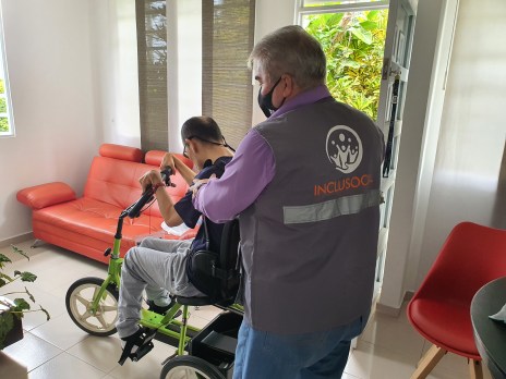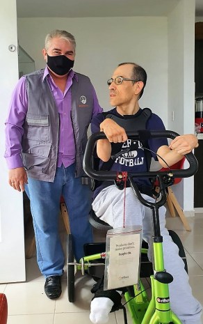 El presidente y representante legal de la Fundación para el Desarrollo de la Solidaridad y la Inclusión Social INCLUSOCIAL, Jorge Escalante Miranda, certifica la entrega en calidad de donación, de un triciclo adaptado marca Rifton R-130 a Diego Fernando González, quien tiene una disminución severa en su movilidad debido a que padece de parálisis cerebral espástica.